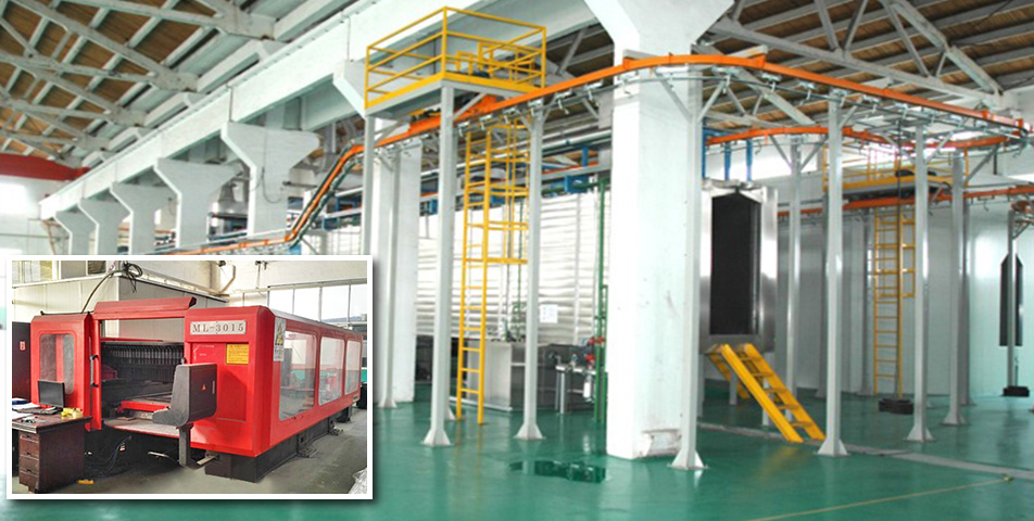 開式壓力機(工作壓力25噸-400噸)﹑瑞士金馬智能化靜電噴粉流水線﹑揚力高速精密自動車床及激光切割車床等設備.并配備多功能關節臂、